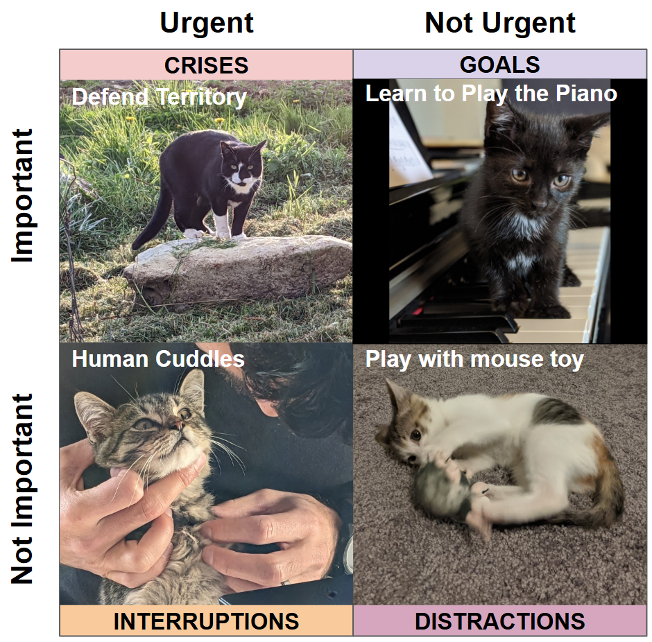 Let’s face it –we’re not robots, and we don’t want to be productive all the time. Use activities in Quadrant 4 as built-in rewards. For example: “if I get through this stack of bills, I get to spend 15 minutes watching funny cat videos.”